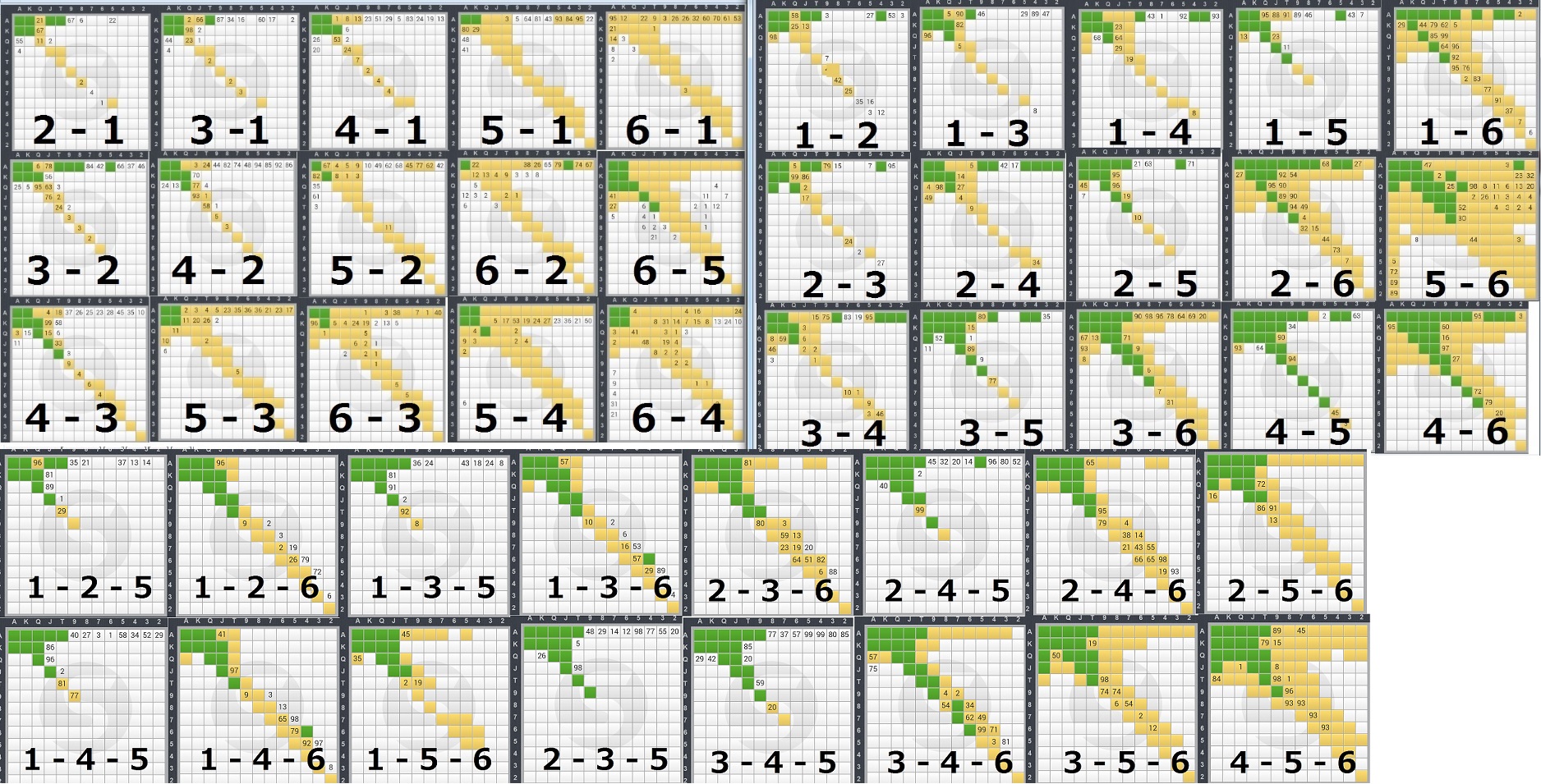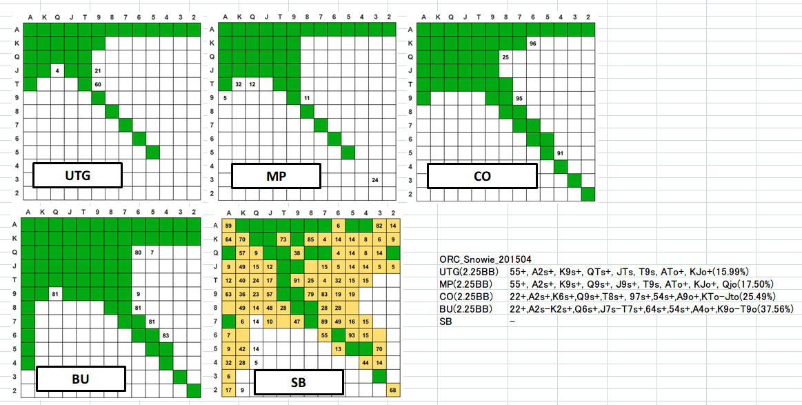 黄色がコール、緑がレイズ、中の数字の割合でレイズ(黄色75なら75%3bet25%call)