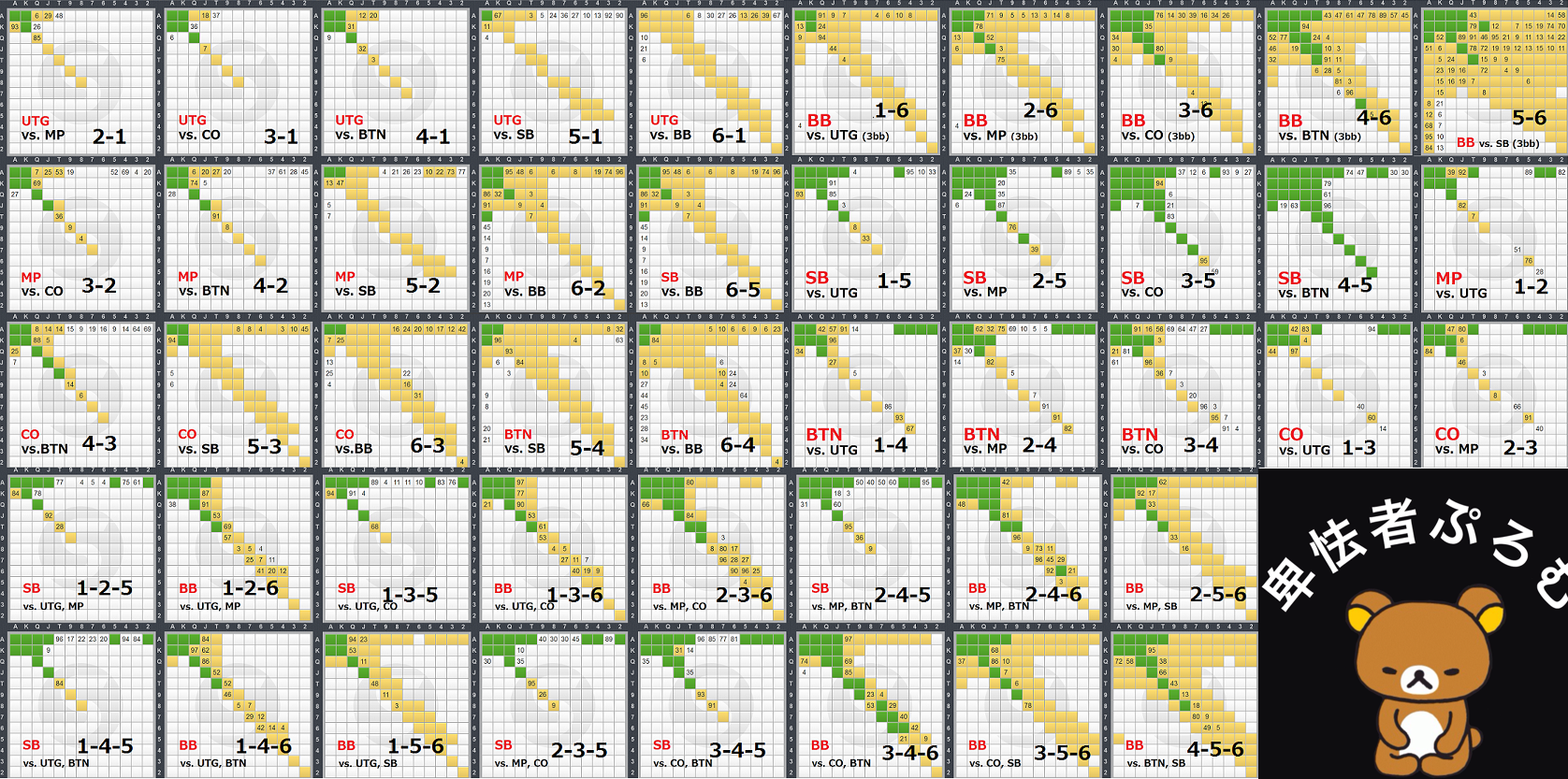 左上は相手の3betに対する抵抗レンジ。数字が逆になってるから見間違えることはない、と思う。