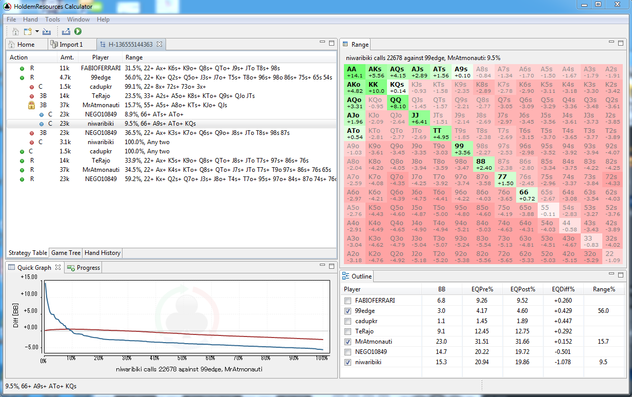 BBのコールレンジは4.2%まで減少しました。AJoも除かれています。セミファイナルでそこそこ上位を狙えるチップを持っている状況下では、テーブルチップリのBTNのプッシュに対して非常にコールしづらいということが分ります。このように、複数のソフトを用いて計測することも時には重要となります。
