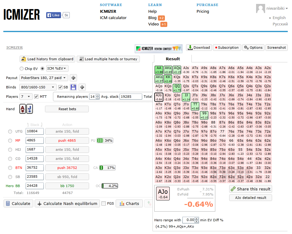 基本的な復習はHRCを用いることが圧倒的に高効率ですが、僕のようにまだトーナメントバブルファクターやICMについての理解が備わっておらず、感覚が研ぎ澄まされてないプレイヤーはこのような補助ツールを使うべきだと思います。ICIMIZERはまだ無料会員ですがこれがちで買っちゃおうかな・・・。