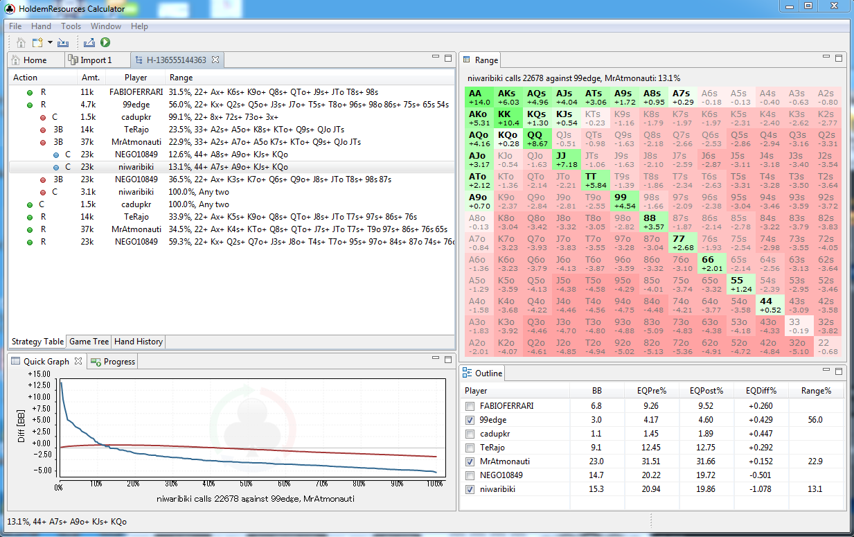 そこを復習するためのツールがHRCです。賞金期待値(ICM)やナッシュ均衡を用いることにより、かなり最適に近いレンジへアプローチしてくれます。最適に近いと表記したのは、完全ではないからです。微調整として人の手を借りるところもあります。