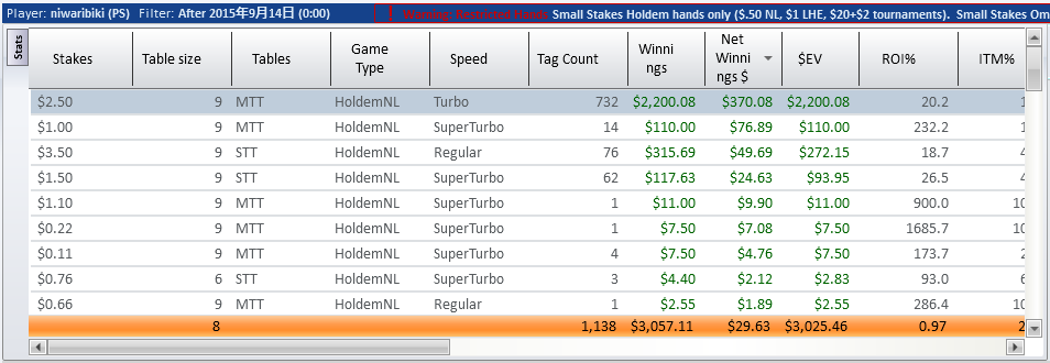 調子が悪かったのは、MTT全般(2.20 2x、2.20ターボ、3.30ノーマル、3.30PSKO、2.70KO、2.20R、2.20ActionH、1.10 3x、$1.65 3xSat)です。良いところがひとっつもありませんでした。