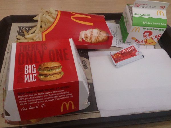 香港の空港で食べた。普通のマック。牛乳があるのが良い。