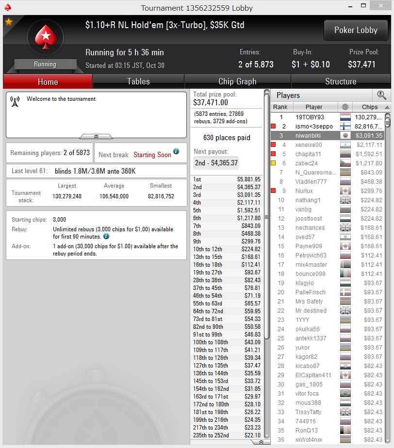 ・$3.50+R NL Hold’em [180 Players, Turbo, Rebuy] に挑戦しています。